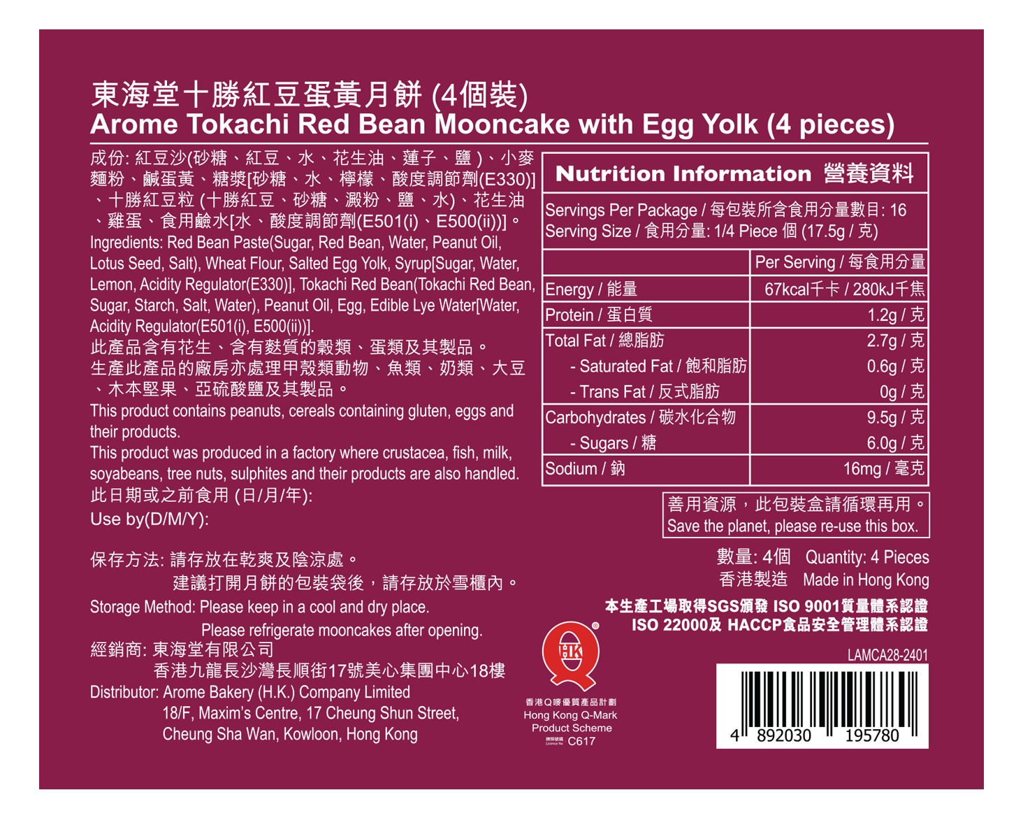 採用日本北海道十勝紅豆,豆香濃郁,帶純樸自然的香甜口味。採用洗沙紅豆餡,歷經煮豆、磨漿、壓沙等步驟,再配合優質鹹蛋黃,口感綿軟,甜而不膩。精緻和風禮盒設計,滿載時尚品味。