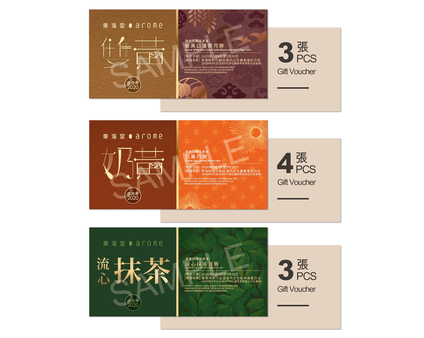 本套裝包東海堂奶黃月餅禮券4張、東海堂雙黃白蓮蓉禮券3張及東海堂流心抺茶月餅禮券3張 一套共10張 (每張禮券附一個禮券封) 香港滙豐信用卡6折優惠,以零售價計算。 免運費 (產品相片只供參考)